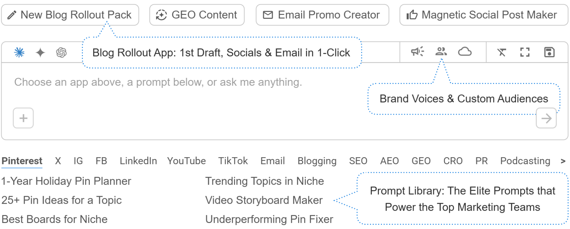 1-Click Access to Brand Voices, Audiences, Saved Prompts & the Core Four Apps